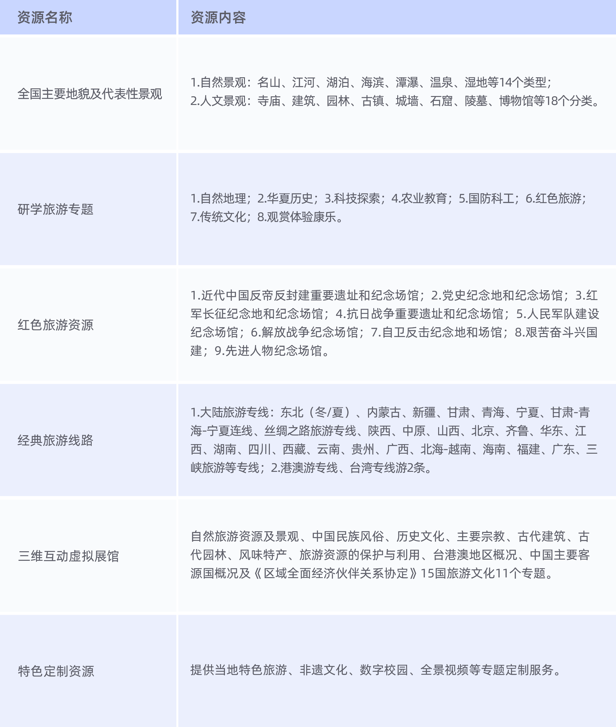 【特色資源及定制服務】軟件資源包括全國主要地貌及代表性景觀、研學旅游基(營)地、紅色旅游資源、經典旅游線路、專題虛擬展館等VR實景及三維互動虛擬資源。提供當地特色旅游景區、非遺文化、數字校園等專題資源定制服務,滿足用戶多樣化的教學需求,使教學內容更加貼近實際、更加具有針對性。
